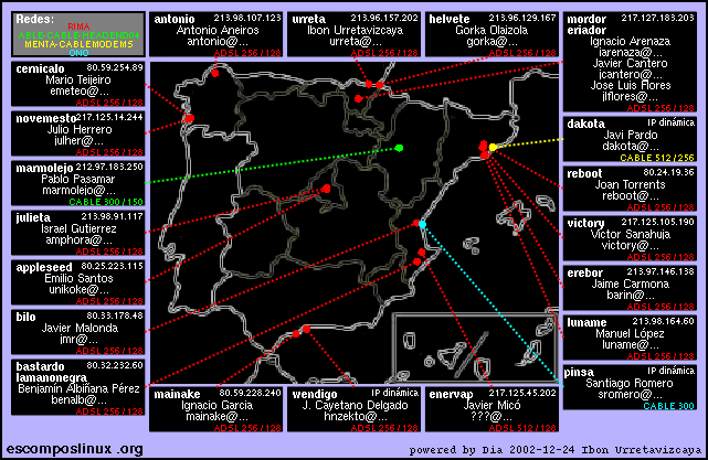 So the idea is easy: we take a few computers with a relatively decent Internet connection and create a network providing services. Adding resources and allocating necesities and responsabilities, we have achieved a network which works on small computers and basic DSL Internet connections, depending just on ourselves and our capability to keep the boxes working. EcolNet also allows us to experiment the management of a Linux server, having fun with it, and puts on our shoulders the responsability to keep things working, which is sometimes a bit stressing. But that's what the root life is like, isn't it? ;)