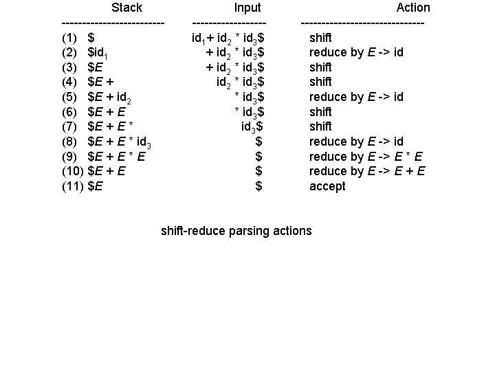 The substrings that are the right side of a production and when replaced with the left side of that production in the input string that leads eventually to the start symbol is called a `handle'. Now, the process of bottom-up parsing may be viewed as one of finding and reducing `handles', the reduction sequence being known as `handle pruning'.A convenient way to implement a shift-reduce parser is to use a stack and an input buffer. Let `$' symbol mark the bottom of the stack and the right end of the input.